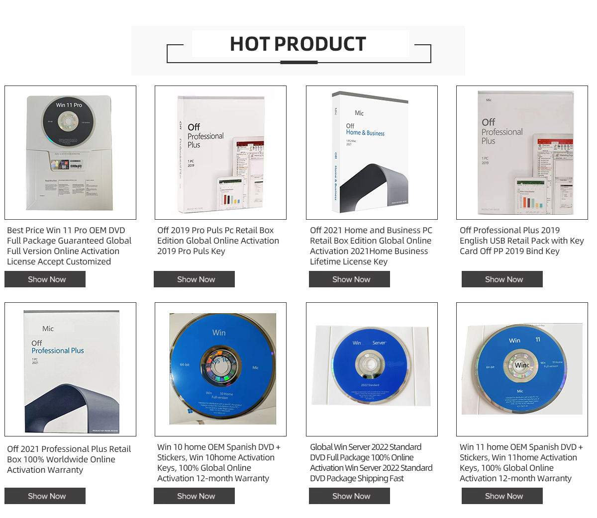 Productos principales:USB,DVD, software de oficina, software de sistema, pegatinas